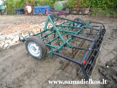 3.2m,ten ne kampas o sija H perpjauta ir suvirinta,nezinojau kaip geriau lygins,todel padareu apacia lygia o kampa i virsu reikalui esant galima apversti,buvo 60kg dar pjoviau ir lengvinau nes per daug trauke zemiu,pries dantis zeme kieta ir netaip lygina,sis variantas man labiau patiko,nubrauke lygiai ir abdauzo grumstus o voliukai dar susmulkina,o ant grandiniu dejau kad laisvai kopijuotu per akmenius,o zemiu tikrai buvo ivairiu, kietu,lengvu ir svieziai artu pievu,dar kultivuosiu darza tiai idesiu foto darbo eigoj.
