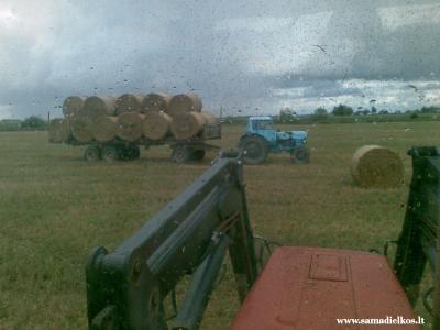 Jo, briketam. O traktorius skolintas is kazkokio girtuokli, tai vairas uzsikirtineja, galinis ratas atsisukes buvo, bet nenusimove