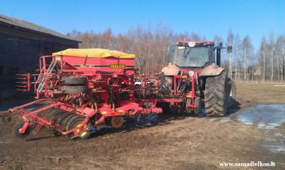 Dirbimas: dvi eiles dantu ir lyginimo lenta, plotis 4m., traktorius case mx200. Gal kiek ir pergalingas tas traktorius, bet su nedideliu rezervu galios visada maloniau dirbti. buvau is draugo pasiskolines ford 8670 (170ag) su mechanine vaderstad, idirbimas identiskas manajai, tik ten buvo su trasom (bet as sejau be trasu), tai i germinuota zeme dar neblogai iseidavo 12-13km/h palaikyti, o tik nulygintam arime, kur gyliau idirbima ileidi, su pilna seklos sejama daugiau 10.5km/h neivarydavau. Zodziu ir traktoriui labai nesveikia, ir paciam nervuoja tais begiais groti, ir tempas letokas, per diena su tuo dussuliu vos 28ha pasejau. Todel sau nusprendziau pirkti biski su galios rezervu. Traktorio ir sejamos kaina 115000lt +pvm